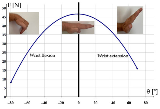 Variation of the force developed by the pneumatic muscle versus the flexion/extension angle of the wrist.