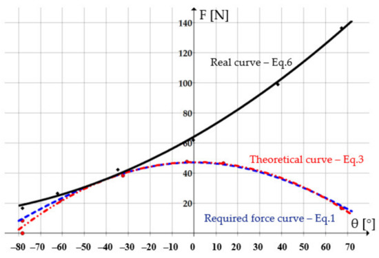 Figure 11 shows the three curves that describe the variation of the force developed by the pneumatic muscle versus the modification of the flexion/extension angle of the wrist: The curve of the necessary force (Equation (1)), the theoretical curve (Equation (3)) and the real curve according to that the rehabilitation equipment has to function (Equation (6)). To be noted is the fact that the latter curve ensures in each point values of the force that are greater than the theoretically computed ones, and thus the necessary force for the proper operation of the rehabilitation equipment.