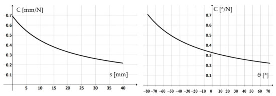 Equation (2) reveals that the dependency between the force developed by the pneumatic muscle and the stroke is not linear, what is indicative of the presence of variable compliance. Compliance is defined by Equation (4):