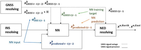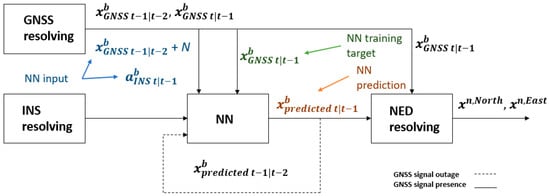 However, as presented in Figure 1, during the training phase, the NN is fed with the GNSS estimated displacement rather than the output of the NN. Both models (training and prediction) are structured this way due to the availability of the GNSS signal during the training phase and its absence in the prediction phase. The NN’s output is thus setup to mimic the functionality of the GNSS resolved displacement at window during the prediction operation.