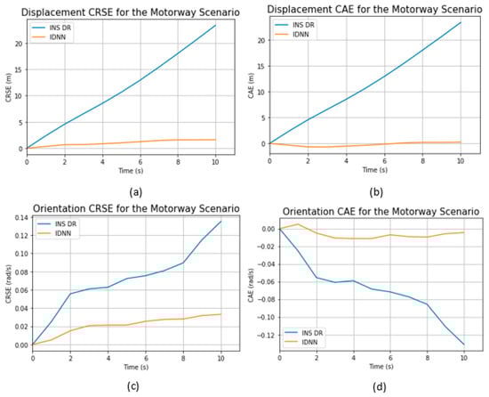 Showing the evolution of the estimation error over time in the motorway scenario based on the (a) Displacement CRSE, (b) Displacement cumulative absolute error (CAE), (c) Orientation rate CRSE and (d) Orientation rate CAE.