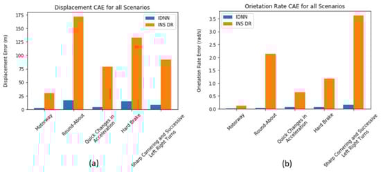 Showing the comparison of the CAE performance of the IDNN and INS DR across all investigated scenarios on the (a) displacement estimation and (b) orientation rate estimation.