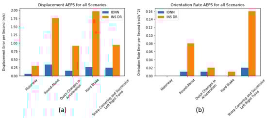 Showing the comparison of the average error per second (AEPS) performance of the IDNN and INS DR across all investigated scenarios on the (a) displacement estimation and (b) orientation rate estimation.