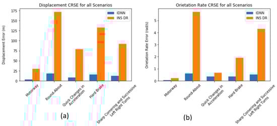 Showing the comparison of the CRSE performance of the IDNN and INS DR across all investigated scenarios on the (a) displacement estimation and (b) orientation rate estimation.