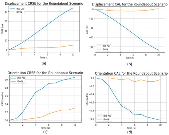 The roundabout scenario is one of the most challenging for both the vehicular displacement and orientation rate estimation. The difficulty encountered by the INS and NN in accurately tracking the vehicle’s motion is graphically shown in Figure 9 with a comparative illustration to other investigated scenarios presented in Figure 5, Figure 6 and Figure 7. The results so obtained as presented on Table 9 show that the NN recorded a lower displacement (maximum CRSE and CAE of 17.96 m and 16.80 m) than the INS (maximum CRSE and CAE displacement of 171.92 m) as well as a lower orientation rate (maximum CRSE and CAE of 0.38 rad/s and 0.05 rad/s, respectively) compared to the INS (maximum CRSE and CAE of 5.71 rad/s and 2.14 rad/s, respectively). The relatively lower standard deviation across all analysed metrics is evidence that the NN is able to more consistently track the vehicles position and orientation on the roundabout scenario but less consistently on other investigated scenarios. The roundabout scenario study was carried out across 11 test sequences over a maximum travel distance of approximately 197 m. Figure 8a shows a sample trajectory of the vehicle on the roundabout scenario analysis.