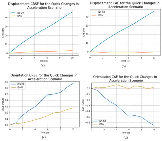 Showing the evolution of the estimation error over time in the quick changes in acceleration scenario based on the (a) Displacement CRSE, (b) Displacement CAE, (c) Orientation rate CRSE and (d) Orientation rate CAE.