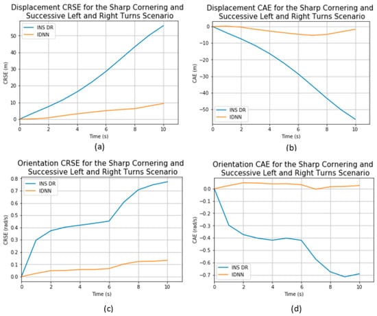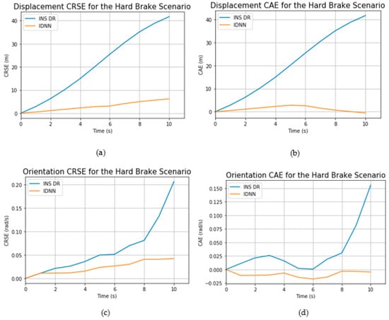 The performance of the NN over the INS in the hard-brake scenario is evaluated over 17 test sequences averaging 188 m of travel with a 259 m maximum journey length. From Table 11, we observe that much to our expectations, the hard brake scenario proves to be more of a challenge for the accelerometer than the gyroscope as the INS struggles to accurately estimate the displacement and orientation rate of the vehicle within the simulated GPS outage period. As further emphasized on Figure 11 and Figure 5, Figure 6 and Figure 7, the NN significantly outperforms the INS DR across all performance metrics employed by max and average CRSE of 15.80 m, 0.25 rad/s and 6.82 m, 0.09 rad/s for the NN compared to 133.12 m, 1.89 rad/s and 41.07 m and 0.37 rad/s, respectively, of the INS DR. The reliability of the NN in consistently correcting the INSs estimations to such accuracy is further established by its value of 4.23 and 0.08.
