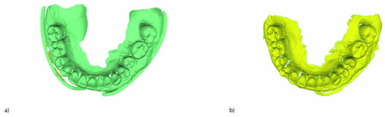 Afterward, the teeth from 3.7 to 4.7 of the preoperative (Figure 2a) and postoperative (Figure 2b) interproximal enamel reduction STL digital files were sequentially segmented, aligned, and individually compared (3-dimensionally) after being imported into a reverse engineering morphometric software (3D Geomagic Capture Wrap v. 2017.0.0, 3D Systems©, Rock Hill, SC, USA).