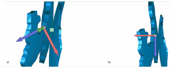 (a) Point of contact between the mesial and distal interproximal enamel reduction meshes before and (b) after being aligned perpendicular to the “X” axis.