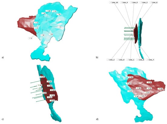 Finally, 10 points were positioned at the inner surface of the interproximal enamel reduction mesh of the anterior tooth (Figure 7a). Then, 10 lines parallel to the “X” axis were projected (Figure 7b) from the previous points to the inner surface of the interproximal enamel reduction mesh of the posterior tooth (Figure 7c). Then, 10 new points were created at the intersection of the lines and the inner surface of the interproximal enamel reduction mesh of the posterior tooth, creating 10 pairs of points (Figure 7d). The distance of each pair of points was measured. These distances were used in order to obtain a mean value of the interproximal enamel reduction between adjacent teeth.