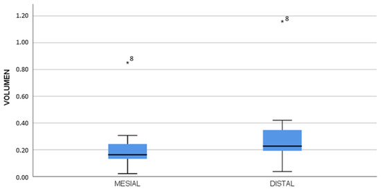 Box plot of the volume of the enamel removed after the interproximal enamel reduction procedure at the mesial and distal interproximal enamel surfaces of the STL digital files. “*” represent outliers in line 8.