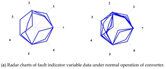 The radar charts generated are shown in Figure 3 below. The numbers 1–7 in the figure represent the 7 fault indicator variables, respectively. Through drawing the graphs, the changes of the fault indicator variable values and the correlation between the fault indicator variables can be intuitively reflected. Figure 3a shows radar charts of the fault indicator variables data under normal operation of the converter; Figure 3b presents radar charts of the fault indicator variables data under faulty operation status of the converter.