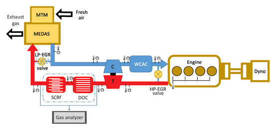 The engine was installed in a test bench that was equipped with an Elin EBG dynamometer controlled by AVL PUMA Open 2. According to the scheme that is shown in Figure 1, the most relevant characteristics of the experimental facility was the coupling of the engine with Horiba MEDAS, an altitude simulator that was developed by CMT-Motores Térmicos [33,34]. MEDAS provides variable working pressure to the engine as a function of the requested driving altitude. This simulator is coupled to the engine intake, exhaust, and sump, and it communicates with the engine control unit [36,37]. Additionally, the ambient temperature was imposed by means of the MEDAS temperature module (MTM), which was placed upstream of the MEDAS core module. With this setup, the driving conditions can be emulated in conventional test cells, with a variable altitude from sea-level to 5000 m and ambient temperature ranging between −15 and 45 °C.