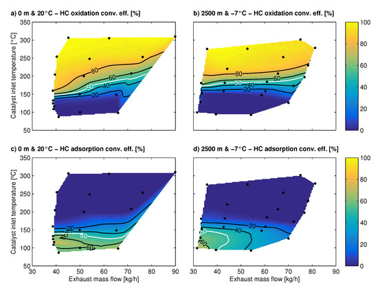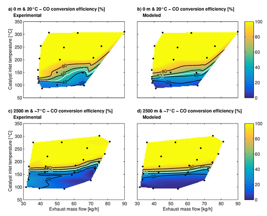 Figure 4 shows the CO conversion efficiency contour maps for the two tested ambient conditions as a function of the exhaust mass flow and DOC inlet temperature. The upper row represents the experimental (Figure 4a) and modeled (Figure 4b) CO conversion efficiency at sea-level and 20 °C, whilst Figure 4c,d do the same at 2500 m and −7 °C. The black dots on the contours represent the measured steady state points.