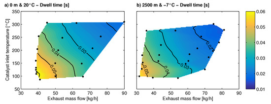 Dwell time as a function of the exhaust mass flow and catalyst inlet temperature: (a) 0 m and 20 °C; (b) 2500 m and −7 °C.
