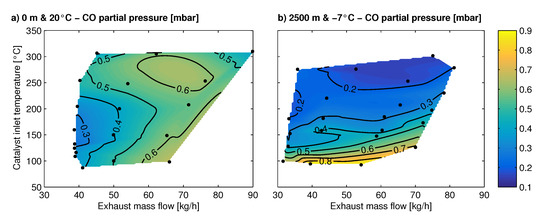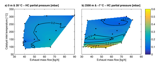 partial pressure as a function of the exhaust mass flow and catalyst inlet temperature: (a) 0 m and 20 °C; (b) 2500 m and −7 °C.