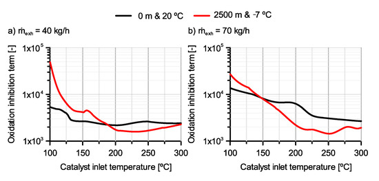 Inhibition term as a function of the DOC inlet temperature and ambient conditions for (a) 40 kg/h and (b) 70 kg/h in exhaust mass flow.