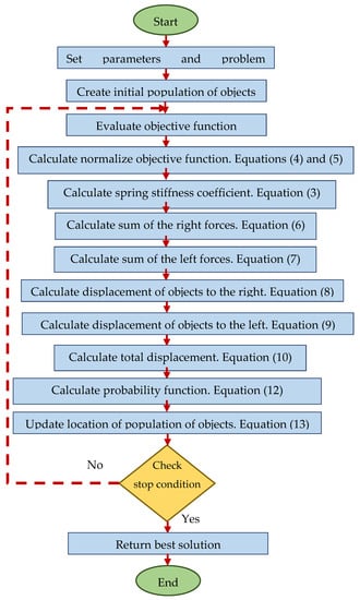 In the BSSA, the population of the algorithm is first defined randomly. Then, in each iteration, the position of each member of the population is updated according to Equations (3)–(10). Additionally, the spring constant coefficient is updated in each iteration according to Equation (3). This process is repeated until the algorithm reaches the stopping condition. Therefore, the various steps of implementing the BSSA can be expressed as follows: