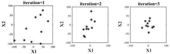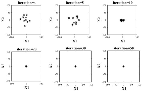 This problem is solved for two dimensions with 50 iterations and 10 bodies as the problem population. In the first iteration, the members of the population are randomly placed in the problem space. It is observed in Figure 2 that the proposed algorithm extensively searches the search space in the initial iterations to cover the defined space of the problem with high search capacity. Over time, it is seen that the proposed algorithm converges towards an optimal solution, and members of the population are concentrated in the vicinity of this optimal solution. The high capacity of the algorithm is presented for a quick exploration of the optimal solution. The numerical results of the test function in different iterations are shown in Table 1.