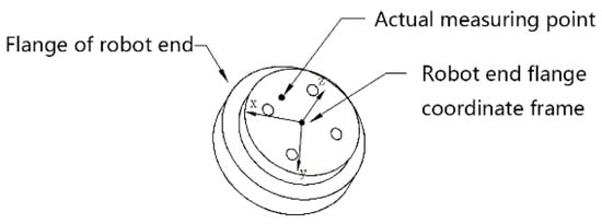 The key step of robot calibration is to obtain the actual pose error of robot end by measuring. However, the FCS of robot end is usually “hidden”, that is, it cannot be directly measured by measuring equipment [22]. There is a certain offset of the actual measured position with respect to the FCS (as expressed in Figure 2).