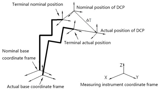 Position error model is comparatively more general, so the pose error of DCP is neglected. Assuming the set of parameter errors is , based on Equation (19), the actual position model of DCP can be expressed as follows: