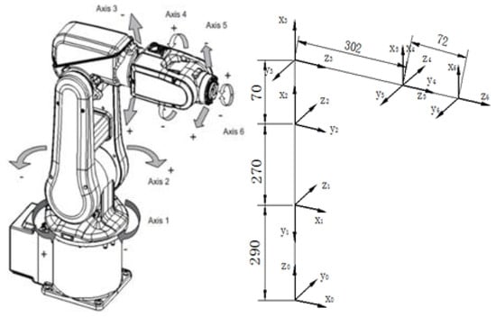 The most common kinematics model of industrial robots is the four-parameter DH model (short for Denavit–Hartenberg model) proposed by Denavit [20] et al. in 1955. This model has good generality and is currently the most widely used. However, in practice, it is found that when two adjacent axes are nominally parallel, the small deviation of their mutual joint will lead to the numerical distortion in the process of parameter identification based on DH model that means the parameters are discontinuous. To avoid this problem, Hayati [21] proposes the MDH model—a modified DH model, which adds a rotational parameter to the Y axis and becomes a five-parameter model with two translations and three rotations.