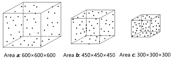 In order to verify the correlation between calibration effect and the distribution of calibration points, add the following experiments: Take the point [300, 300, 300] in the RBCS as the center, respectively establish three kinds of cube space with the size of 600 mm, 450 mm, and 300 mm, defined as areas a, b, and c respectively. Fifty groups data of robot’s pose are measured in the three areas, respectively, and ensure that the pose of sampling points are evenly distributed in each space, as shown in Figure 9.
