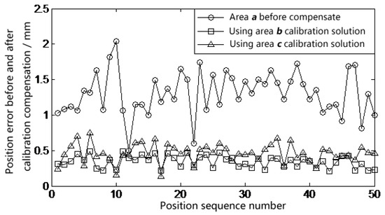 The sampling points in the b and c areas are taken as calibration points to the position error identification algorithm. The calculated parameters errors results are compensated respectively to the sampling points in area a. Calculating and comparing the errors before and after calibration, the experimental results are shown in Figure 10 and Table 9.