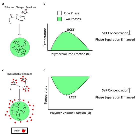 Because liquid-liquid phase separation occurs in a precise thermodynamic regime, biomolecular condensate formation and dissolution is intrinsically responsive to stimuli that shift the system in and out of these regimes. However, how biomolecular condensates respond to stimuli depends on the nature of the intermolecular interactions that generate them (Figure 1). Temperature, naturally, affects the thermodynamics of phase separation. In Flory-Huggins theory, phase separation is enthalpically driven, and so theoretically simple polymer condensates have an upper critical solution temperature (UCST) above which phase separation will not occur []. However, many phase-separating systems instead have a lower critical solution temperature (LCST) below which phase separation does not occur. These polymer condensates are often entropically driven by the release of water from hydrophobic polymer surfaces []. Hydrophobic residue-rich proteins such as elastin-like polypeptides and the protein BuGZ phase separate with increased temperature, and indeed BuGZ mutants replacing aromatic residues with the polar residue serine require much higher temperature and concentration to phase separate [,]. Ddx4 condensates on the other hand, which are driven by electrostatic interactions, form at lower temperatures and dissolve upon heating [].
