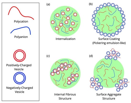 Different observed arrangements of vesicles within or around a complex coacervate. These are illustrative examples; these spatial arrangements are not definite based only on the charge of the components present. Vesicles can (a) be internalized within a coacervate, (b) coat the surface of the coacervate, (c) form a fibrous internal structure with a coacervate component, and (d) form aggregates with a coacervate component at the coacervate surface.