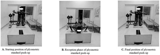 The subjects did not complete any training outside of the handball team throughout the study’s duration. Each Tuesday and Thursday for 8 weeks, the experimental group substituted part of the standard regime (the technical–tactical part) with elastic band plyometric training (Table 1). The elastic band (Thera-Bands®; Hygenic Corporation; Akron, Ohio, USA) system included two latex bands of differing elasticities: black (special heavy) and silver (super heavy). The subjects performed exercises with maximal effort (maximal concentric velocity). The loaded plyometric program comprised two exercises: plyometric standard push-ups (Figure 1) and plyometric diamond and wide arm push-ups (Figure 2). Training sessions began with a 15 min warm-up and lasted for 20 min (a total of 35 min).