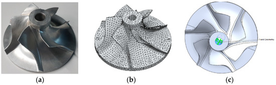 Figure 3a). The correct impeller design enables the pump to deliver the desired properties, while also decreasing the operating costs. For this reason, it is necessary to optimize the design variables that affect the impeller performance. The aluminum impellers used in this study are widely used in the industry and are known for their strength, corrosion resistance and excellent heat resistance. Impeller failure is frequently encountered as a result of fatigue. Resonance is an undesirable situation on an impeller. To avoid impeller resonance, an optimum design is important. Therefore, determining the modal analysis, which is the first step of the dynamic analysis before designing impellers, is of great importance. This study aims to obtain the mode shapes of an aluminum impeller by modal analysis. The first six natural frequencies are obtained through modal analysis. Knowing the natural frequencies is important for determining the region where resonance may occur in the system. The deformation on the first six mode shapes is examined after determining the natural frequencies. The geometric model is designed on Computer Aided Design (CAD) software. For the design of the geometric model, a computer-aided design program Solidworks 2019 is used. The material properties, mesh and boundary condition steps are determined before obtaining the simulations results. On the CAD software, the value of the size to be calculated in an element is found by interpolation, using the values in the nodes. In the finite element method, the unknown and required values are the values in the nodes. Using a variance principle, a set of equations is obtained for the values of the size field at the nodes. This impeller is made of 6061 aluminum alloy, and 51,422 nodes and 32,265 meshes are used in the model design (