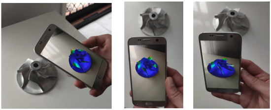 Figure 4b). The combined data is imported as an Fbx. file on Unity Hub. Unity Vuforia Model Target is used to create an Android package kit (APK) file. An Android package can be installed on a mobile phone or tablet. The AR android program, which is designed to operate when the camera of a mobile phone or tablet sees the real product, recognizes the real product and fits the 3D analysis result on the real product. In this way, the FEA result is provided so as to be displayed on the real product. Moreover, engineers can see the analysis result on the real product in the real environment with the naked eye. Accordingly, the analysis results can be seen in the real environment.