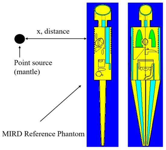 Here one seeks organ dose conversion factors (DCFs), estimating organ equivalent doses from gas lantern mantle radiation exposure [,,]. For this, a series of simulations were undertaken involving the five main series of gamma photons from 232Th, use being made of the Monte Carlo N-Particle radiation transport code, version MCNP5 (Los Alamos National Laboratory), also involving medical internal radiation dose (MIRD) mathematical phantoms, male and female (Figure 3) (male phantom 178 cm tall, weight 91 kg; female phantom 168 cm and 72 kg). The mantle was taken to be a sphere of 4 cm diameter. In evaluations the mantle M5 was located at 10, 20, 50, and 100 cm separation from the chest in order to estimate the effective dose. Further to this, organ equivalent doses for 21 organs of the male and female phantom were obtained, with the mantle simulated at 20 cm from the chest.