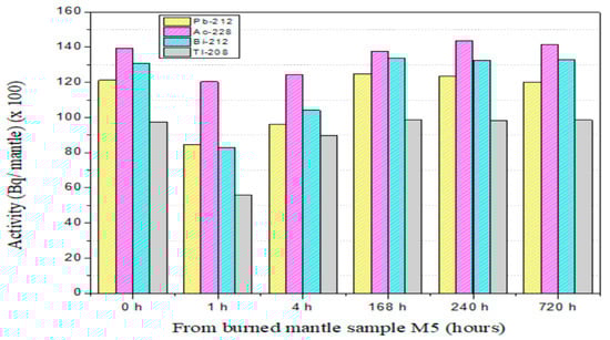 To estimate the amount of radioactivity vaporizing in the burning of the mantles, gamma emissions from the mantles were measured before and after burning, with results recorded in Figure 4; zero-hour represents the unburned mantle while the 1, 4, 168, 240, and 720 h temporal points represent the time delays between initial and post-burn measurements. Subsequent to the initial ignition and termination period, daughter nuclides fractional evaporation is observed, detected at the first-hour temporal point, the initial concentrations of 212Pb (t1/2 10.6 h), 212Bi (t1/2 1.01 h), and 208Tl (t1/2 3.05 m) decreasing by 30%, 37% and 43%, respectively. At 168 h, the build-up of the daughter nuclides restores the initial concentrations, the residual ash retaining the greater thorium fraction. The result accord with previous studies of Luetzelschwab and Googins [] and Al-Jarallah et al. [] and Furuta et al. [], each concluding that thorium is subject to minimal evaporation during burning.
