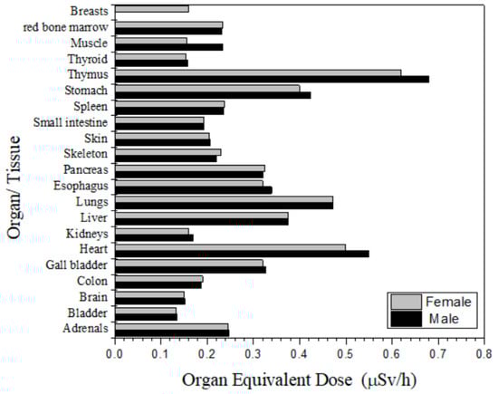 Organ equivalent dose (µSv/h) for the 21 organs of the MIRD5 mathematical male and female phantom with mantle M5 simulated 20 cm from the chest.