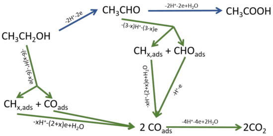 Direct alcohol fuel cells (DAFCs) have been considered as an alternative source of energy for many electronic devices [1,2]. DAFCs present several advantages over lithium-ion batteries (LIBs), which are normally used in these electronic devices, and hydrogen-feed polymer electrolyte membrane fuel cells (PEMFCs). LIBs cannot be used as the power source in portable devices or even in stationary devices where an electrical energy source is not available. Under these conditions, DAFCs are the best choice for such devices [3,4]. Although the theoretical voltage of DAFCs and PEMFCs are approximately the same, alcohols present with fewer problems of storage and transportation. Alcohols have a high energy density (4000–7000 Wh L−1) which is similar to those of hydrocarbons (9800 Wh L−1) while the power density of hydrogen (180 Wh L−1) is lower than DAFCs [5]. These properties reflect the theoretical superiority of DAFCs over PEMFCs. Different kinds of alcohols can be used as fuel in DAFCs, each of them has its own advantages and disadvantages [6]. Although there are studies on the use of ethylene glycol [7], propanol [8], and butanol [9] as fuels in DAFCs, the most widespread alcohol-based fuels are methanol and ethanol [10,11,12,13,14,15]. In addition to the high energy density and nontoxicity of ethanol, the balance of CO2, the most common greenhouse gas, in the environment is preserved during ethanol oxidation because ethanol can be obtained from biomass. Thus, there is a circulation between ethanol consumption and ethanol production through the fermentation process of agricultural products [6]. Regarding its oxidation mechanism on platinum electrodes, it has been well confirmed that ethanol oxidation reaction (EOR) can take place through a parallel pathway [16,17,18]. In the first route (blue arrows in Figure 1), the so-called C2 pathway, the C-C bond is not broken, and ethanol is first oxidized to acetaldehyde, which can be further oxidized to acetic acid (or acetate in alkaline solution) [19,20]. This route exchanges four electrons and releases only one-third of the formal energy density of ethanol. The release of the whole energy stored in ethanol is obtained through the C1 pathway with the exchange of twelve electrons. This route (green arrows in Figure 1) proceeds through the breaking of the C-C bond in the early stages of the oxidation process and produces adsorbed CO which can be further oxidized to CO2 (or carbonate in alkaline solution). CO is considered a poison intermediate because it is strongly adsorbed on the surface (blocking surface sites) and its oxidation requires high overpotentials. The efforts that expedite oxidation of CO to CO2 and decrease the potential of CO oxidation remarkably improve the electrocatalytic activity towards EOR [20].