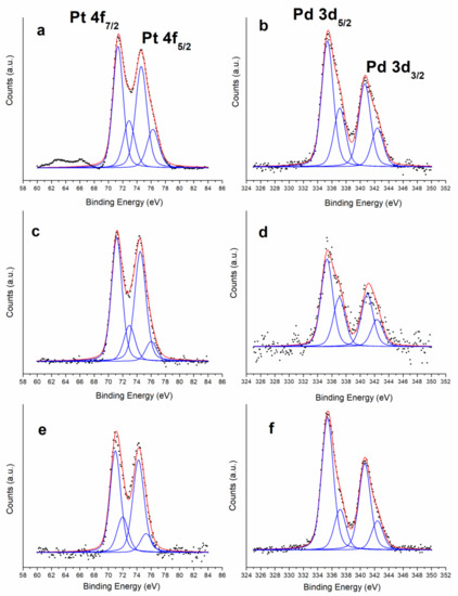 The XPS experiments were performed to determine the electronic properties of the nanoparticles, as shown in Figure 4. In some cases, XPS can also be used to characterize the surface composition. However, it is important to note that XPS is not a pure surface method because the electrons penetrate a few nanometers into the material. For nanoparticles with an average size of about 3.4 nm, the spectra contain information from the whole nanoparticle [35]. We profit this property to determine the composition of synthesized nanoparticles by XPS [34]. The results are shown in the last column of Table 2. As can be seen, the values agree, within the error of the techniques, with the nominal values and those measured by AAS, UV-Vis, and EDX techniques. Regarding the electronic properties, the Pt 4f and Pd 3d regions of the spectra are going to be examined. The Pt 4f peaks in the spectra of Pt, Pt4Pd, and PtPd4 are shown in Figure 4a,c,e. The deconvolution of the Pt 4f peaks shows two pairs of doublets. The pair located at 71 eV () and 74.7 eV () are attributed to Pt0 and the second pair at 72.9 eV () and 76.4 eV () are related to Pt2+ species. The analysis of the region corresponding to the Pd 3d region displays very similar results. Pd0 shows a doublet with a binding energy of 335 eV () and 341 eV (), whereas the pair of peaks at 337.1 eV () and 342.8 eV () are related to the presence of Pd2+ [38,39]. The ratio of the intensity of Pt2+ and Pt0 (and also for Pd2+ and Pd0) proves that Pt and Pd are mostly in their reduced form. On the other hand, the analysis of the peak position indicates that the formation of the PtPd alloys modifies the peak positions. As the Pd ratio increases, the Pt 4f peaks shift to lower binding energies. On the other hand, the increase of the Pd ratio shifts the binding energy of Pd 3d electrons to lower values. The changes in the binding energy observed with the Pt:Pd ratio demonstrates the change of electronic structure due to the formation of a PtPd alloy and the presence of electronic effects [32,40].
