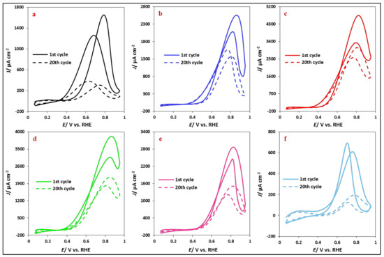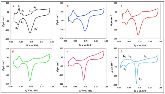 The electrochemical characterization of the nanoparticles was carried out by cyclic voltammetry in a 0.1 M NaOH solution at a scan rate of 0.05 V s−1 (Figure 5a–f). The sharpness, good definition, and the symmetry of the adsorption states in all nanoparticles are clear evidence of the effective surface cleanliness [36,37,41,42,43,44]. The observed signals in the profiles correspond to hydrogen ad(b)sorption-desorption (Had(b)s-Hdes), OH adsorption (OHads), metal oxidation, and reduction processes. The position and definition of those signals depend on the ratio of Pt:Pd in the synthesized nanoparticles. For the pure Pt nanoparticles, the pairs of peaks in the positive potential sweep (a1,a2) and their symmetric pairs of peaks in the negative potential sweep (a1’,a2’) corresponds to the desorption and the adsorption of H on the surface of Pt nanoparticles, respectively [20,29,36]. On the other hand, the formation of Habs and Hads on the surface of Pd nanoparticles takes place in a single peak in the negative potential sweep (b1’), whereas the desorption of Habs and Hads split into two peaks (b1,b2) in the positive scan direction (Figure 5f) [45,46,47,48,49]. The OH adsorption, oxidation of Pt-OH to Pt-O, and reduction of PtO to Pt are associated with peaks a3, a4, and a4’, respectively, in Figure 5a. On Pd, the adsorption of OH is not well defined, and the process corresponding to the Pd oxidation/reduction processes are marked by peaks b3 and b3’. The comparison between Figure 5a and f demonstrates the reduction of PtO (a4’) takes place at more positive potential than that of PdO (b3’) on the nanoparticles. The potential values of the Pt(Pd)O reduction peak of the synthesized nanoparticles have been compared in the 4th column of Table 3. This observation reveals a higher tendency towards surface oxidation for Pd than for Pt nanoparticles [50]. Although the reduction of metal oxide represents a sharp peak on the surface of Pd nanoparticles (Figure 5f), the reduction of metal oxide exhibits a broader peak at more positive potentials on the surface of Pt nanoparticles (Figure 5a). This process can be also understood from the comparison between values of width at half height of Pt(Pd)O reduction peak reported in the 3rd column of Table 3 [46,47,50]. The peak asymmetry of the oxidation/reduction reaction of the Pt and Pd surfaces clearly indicates that these are irreversible processes. Thus, in this potential region, the actual surface state depends on the scan direction. For the bimetallic nanoparticles, as seen in Figure 5, the profile changes according to the Pt:Pd ratio. Although a1 and a1’ peaks are entirely separate from the peaks of a2 and a2’ for the synthesized nanoparticles with Pt percentage above 80%, they merge in a single peak as the Pd ratio increases [33,37,51]. The potential of the metal oxide formation also shifts according to the composition [20,29,51,52].