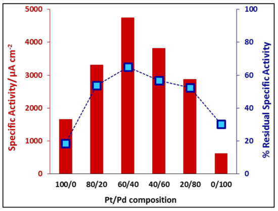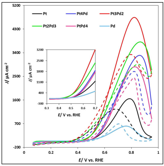 The specific activities were calculated via the normalizing of the currents to the active surface area of the nanoparticles [46]. As it is seen in Figure 6, the peaks attributed to H ab(d)sorption/desorption are suppressed and two well-defined anodic peaks appear in the forward and backward scans. The disappearance of the hydrogen peaks is attributed to the adsorption of the resultant ethoxy species, such as (CH3CO)ads, which blocks the electroactive sites. The activity for the positive scan direction reaches a maximum at ca. 0.8 V and then decrease as potential increases. The downfall of the current density corresponds to the formation of the Pd and Pt oxide layers, which block the adsorption of the reactive species onto the catalyst surface and lead to a decrease in the electrocatalytic activity. At 1.2 V, the surface of the nanoparticles is completely covered with PdO or PtO, which is inactive for the EOR, and the current density at this potential coincides with that recorded in absence of ethanol. When the scan is reversed and PdO or PtO is reduced, the electrode recovers its activity. This phenomenon results in the appearance of a peak in the negative scan direction [20,29]. There is a hysteresis between the positive and negative scan directions. First, the peak intensity is lower in the negative scan direction. This diminution can be due to two different reasons: (i), the surface in the negative scan direction is still partially covered by PtO or PdO and/or (ii) the surface has been poisoned by the polymerization of the acetaldehyde (which is the result of the partial oxidation of ethanol) through the aldol condensation. On the other hand, at ca. 0.5 V, which is the onset of the EOR, currents in the negative scan direction are higher, which reveals that in the positive scan direction the surface may be blocked by some ethoxy adsorbed species, which have been oxidized at higher potentials. Regarding the evolution of the current densities with the PtPd ratio (Figure 6), PtPd binary catalysts exhibit considerable improvements over pure Pt and Pd [22,53]. In other words, the electrocatalytic activity of Pt nanoparticles improves by the incorporation of Pd on the nanoparticle and reaches a maximum at a Pt:Pd ratio of 60:40. Not only peak currents are higher but also the onset potential diminishes. After that ratio, the electrocatalytic activity of PtPd nanoparticles decreases. These results are in good agreement with the reports by other groups [20,53].