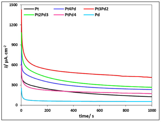 In order to consider the stability of mono and bimetallic Pt and Pd nanoparticles towards ethanol oxidation in the alkaline media, the chronoamperometric experiments were performed at a constant potential of 0.56 V vs. RHE. This potential was selected since the electrocatalytic oxidation of ethanol has been begun at this potential, but the current is not controlled by the ethanol diffusion, so that any diminution of the current cannot be attributed to this phenomenon [19,20]. Figure 9 shows the transients measured at 0.56 V for each nanoparticle sample for 1000 s. The general behavior of the transients shows a fast current decay during the first minute followed by a quasi-steady state in the middle region. Additionally, the reactivity trend follows the same behavior as that recorded in Figure 6 and Figure 7. The highest and lowest current densities during CA experiments are obtained for Pt3Pd2 and Pd nanoparticles, respectively. The highest ratio of the current at 1000 s to the initial current corresponds to the Pt3Pd2 nanoparticles. This result indicates that the general behavior obtained for the voltammetry is also applicable to the potentiostatic currents, that is, PtPd alloy acts as a bifunctional catalyst in which Pt sites are used to dehydrogenate ethanol to produce acetaldehyde, and Pd sites proved the oxygen group required to oxidize acetaldehyde to acetate.