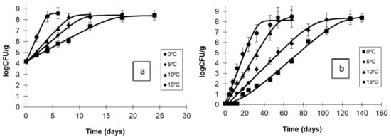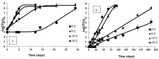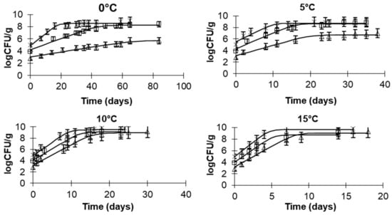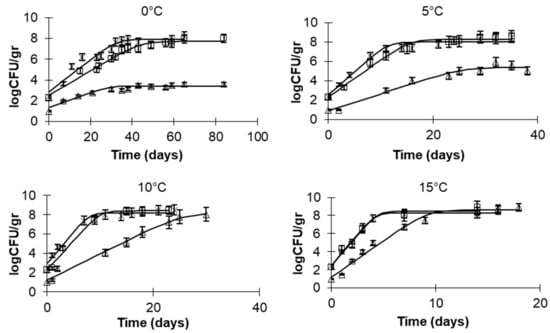 y(t) = lnx(t) with x(t) the cell concentration (CFU/mL), y0 = lnx0, and ymax = lnxmax with x0 being the initial and xmax the asymptotic cell correlation, respectively. The growth rates (μmax) were estimated, and they are presented with the corresponding standard errors. The Arrhenius equation was used to estimate the activation energy values, quantifying the effect of storage temperature on the growth rates: