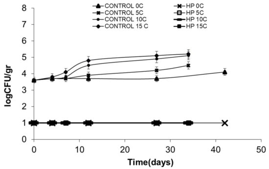 For vacuum packed sliced cooked ham, LAB were also the dominant spoilage microorganisms, and their growth rates were estimated for control untreated samples and for HP treated at 500 and 600 MPa (5 min at 25 °C) (Figure 3, Table 3). Processing of sliced cooked ham at the higher pressure (600 MPa) resulted in significantly (p < 0.05) lower growth rates. At 0 °C storage, the LAB rate was approximately five times lower compared to the rate of control samples. All the other measured microorganisms (Pseudomonas spp., Enterobacteriaceae, Yeasts and molds, Staphylococcus spp., Brochothrix thermosphacta) were below the detection limit for HP treated samples throughout the whole storage period at all storage temperatures. Pseudomonas spp. growth was recorded at all storage temperatures for control samples. Nevertheless, their maximum population never exceeded the 5.2 log CFU/g up to a storage of 40 days (for all studied temperatures) (Figure 4).