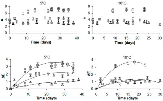 Redness (a) values of Bratwurst sausages’ surface during storage at 5 and 10 °C vs. time for; (x): control samples, (□): nitrite-made samples, (∆): HP-treated samples.