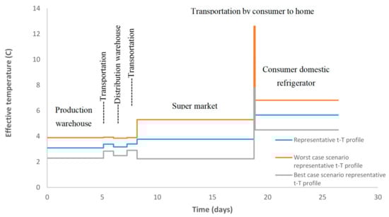 Cold chain management is required in order to reduce meat products’ quality failure and thus reduce food loss and food waste while offering consumers high quality, safe food products. The Cold Chain Database and Cold Chain Predictor software developed within the FRISBEE project could be applied for the building of a representative profile for meat products based on approximately 4500 records of contributed profiles with real time–temperature data measured at different cold chain stages from production to domestic storage [24]. A sequence of real cold chain stages could be used to build a representative t–T profile for meat products such as sliced cooked ham and turkey, as presented in Gogou et al. [24]. The remaining shelf life (SLR) after each stage was calculated considering that microbial growth follows first order kinetics (exponential growth), using Equation (4):