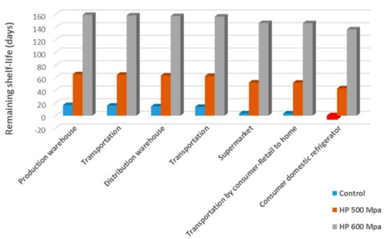 Overall, HP treatment offers significant the shelf life extension of meat products as evidenced above (Table 5). Storage and distribution are the weakest links in the food management. The effective control of temperature conditions is important for the commercial viability of the products, since they often deviate from specifications. Using Cold Chain Database and Cold Chain Predictor software, a sequence of real cold chain stages could be used to build a representative t–T profile for meat products. This sequence consists of the production warehouse, transportation, distribution warehouse, transportation, supermarket, transportation by consumer to home, and consumer domestic refrigerator (Figure 7). The effective temperature (Teff) (defined as the constant temperature that results in the same quality value as the variable temperature distribution over the same time period, based on the Arrhenius model and integrating in a single value the effect of the variable temperature profile) [37] estimated based on the records of contributed profiles is also presented in Figure 7, along with the worst case and the best case t–T profile scenario based on real data. Following the procedure described by Gogou et al. [24] and combining the representative profile (Figure 8) with the kinetic deterioration data presented above for sliced cooked products, assuming that the Lactic acid bacteria (LAB) are the dominant spoilage microorganisms, the remaining shelf life (SLR) of meat products may be estimated at any stage of the built representative profile. This profile was not applied to cooked ham cubes, since it is a product available only for food service and not for home consumption with a significantly short shelf life, while for Bratwurst sausages, the profile is similar to the one of the sliced meat products, but significantly shorter (the whole duration is 15 days, compared to the 27 days profile of sliced meat products depicted in Figure 7). The results validate that HP treatment offers significantly in the reduction of spoiled meat products during storage and transportation and before storage in domestic refrigerators. For untreated sliced cooked hams, the prediction indicates that products are expected to have past their nominal shelf-life even before being stored in domestic refrigerators. Application of HP at 500 and 600 MPa significantly improves this prediction. More specifically, HP at 500 MPa will provide an SLR of 20 days and HP at 600 MPa an SLR of more than six months in consumers’ refrigerators (Figure 8).