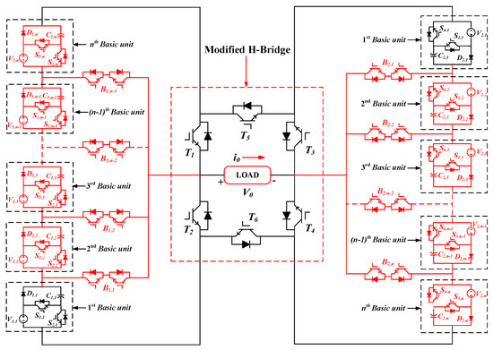 GSMLI: The GSMLI is achieved by including (n − 1) basic units and (n − 1) bidirectional switches (B1,1, B1,2, ……, B1,n−1) to each side of the modified H-bridge, as shown in Figure 1 in red. Therefore, there are 2n total basic units from which n basic units are connected to the left side of the modified H-bridge and the remaining n basic units are on the right side of the bridge.