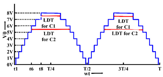 The optimal value of capacitances for both switched capacitors (C1 and C2) is calculated based on the longest discharge time (LDT) over a complete cycle of the fundamental output voltage. The maximum quantity of charges from switched capacitors is discharged during LDT. Figure 4 shows the output voltage of this proposed topology (asymmetric) along with the LDT for both switched capacitors. The LDT for C2 is high compared to C1.