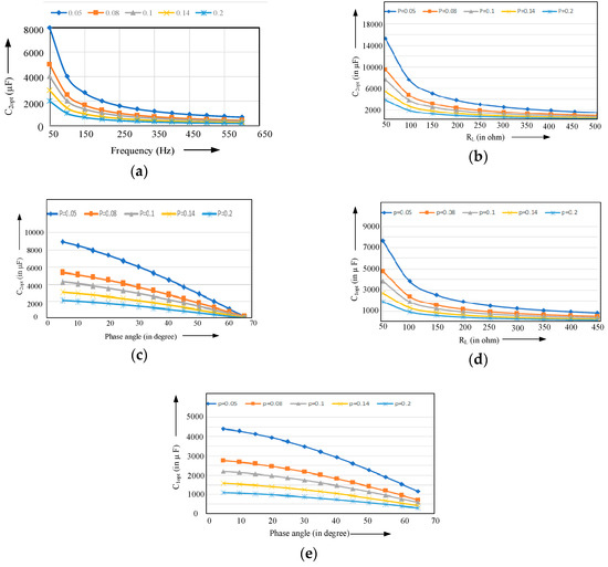 Variation in optimal capacitance C2opt with (a) frequency (f), (b) load resistance (RL), (c) and phase angle for different values of ripple in capacitor voltage and variation in optimal capacitance C1opt with (d) load resistance (RL) and (e) phase angle for different values of ripple in a capacitor voltage.