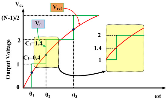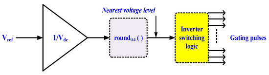 Different modulation schemes are used for controlling the MLI output voltage. Apart from reducing THD, fundamental frequency switching schemes are also capable of minimizing the switching losses. Fundamental switching frequency schemes such as Selective Harmonic Elimination (SHE), nearest level control, and space vector control are preferred for high power applications. The main disadvantage of SHE is to solve the system of nonlinear trigonometric transcendental equations, which consume more computational time. Hence, the SHE technique is not concerned with real-time (closed-loop) applications. The nearest control techniques can eliminate this drawback of SHE. Nearest Level Control (NLC) can be classified as (1) the nearest space vector control and (2) nearest level control [26]. In this work, an optimized nearest level control is utilized for controlling the output voltage and different carrier signals are compared with a reference signal [26]. The level generation method and block scheme are shown in Figure 6 and Figure 7, respectively, for the NLC.